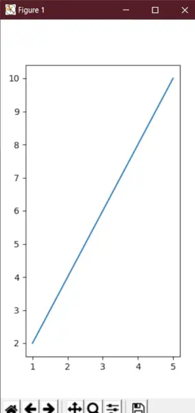 # We start by importing matplotlib> import> matplotlib.pyplot as plt> # Plotting a figure of width 3 and height 6> plt_1>=> plt.figure(figsize>=>(>3>,>6>))> # Let's plot the equation y=2*x> x>=> [>1>,>2>,>3>,>4>,>5>]> # y = [2,4,6,8,10]> y>=> [x>*>2> for> x>in> x]> # plt.plot() specifies the arguments for> # x-axis and y-axis to be plotted> plt.plot(x, y)> # To show this figure object, we use the line,> # fig.show()> plt.show()> |
