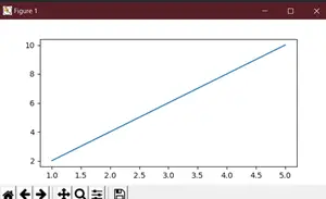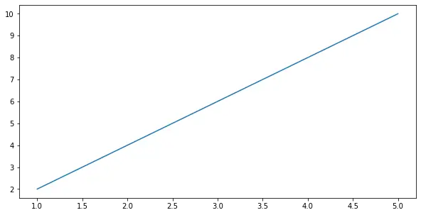 # We start by importing matplotlib> import> matplotlib.pyplot as plt> # Plotting a figure of width 10 and height 5> fig>=> plt.figure()> fig.set_figheight(>5>)> fig.set_figwidth(>10>)> # Let's plot the equation y=2*x> x>=> [>1>,>2>,>3>,>4>,>5>]> # y = [2,4,6,8,10]> y>=> [x>*>2> for> x>in> x]> # plt.plot() specifies the arguments for x-axis> # and y-axis to be plotted> plt.plot(x, y)> # To show this figure object, we use the line,> # fig.show()> plt.show()> |