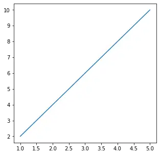 # We start by importing matplotlib> import> matplotlib.pyplot as plt> # Plotting a figure of width 5 and height 5> fig>=> plt.figure()> fig.set_size_inches(>5>,>5>)> # Let's plot the equation y=2*x> x>=> [>1>,>2>,>3>,>4>,>5>]> # y = [2,4,6,8,10]> y>=> [x>*>2> for> x>in> x]> # plt.plot() specifies the arguments for x-axis> # and y-axis to be plotted> plt.plot(x, y)> # To show this figure object, we use the line,> # fig.show()> plt.show()> |