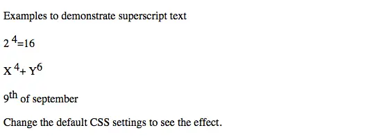 の鬼ごっこ HTML ドキュメントに上付き文字を追加するために使用されます。のタグは上付き文字を定義します。上付きテキストは通常の線より半文字上に表示され、小さなフォントで表示される場合があります。上付き文字は脚注に使用できます。