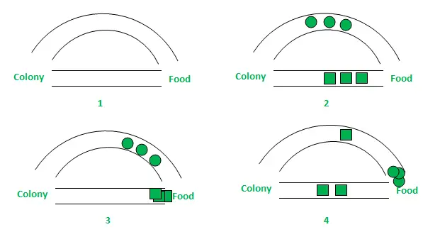 アリは集団の巣に住んでおり、ACO の基本原則は、最短経路で餌を探すために巣からのアリの動きを観察することです。最初、アリは巣の周りで食べ物を求めてランダムに動き始めます。このランダム化された探索により、巣から食料源までの複数のルートが開かれます。さて、アリは餌の質と量に基づいて、必要なフェロモン濃度を持った餌の一部を帰り道に運びます。これらのフェロモン試験に応じて、後続のアリが特定の経路を選択する確率が、食料源への指針となるでしょう。明らかに、この確率はフェロモンの濃度と蒸発速度に基づいています。また、フェロモンの蒸発速度も決定要因であるため、各経路の長さを簡単に説明できることもわかります。